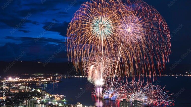 This breathtaking display consists of seven acts over roughly one hour, launching about 10,000 fireworks against the backdrop of Mount Kinka and the natural beauty of the Nagara River. Highlights include the “Seiryu Blue” fireworks, designed to evoke the image of the Nagara River’s clear waters, and the main attraction: a spectacular ultra-wide musical starmine spanning 600 meters. The colorful bursts synchronized with music fill the entire sky before you—an overwhelming experience not to be missed.