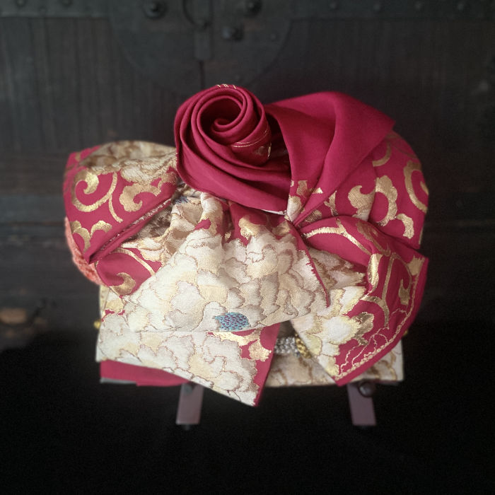 This decorative piece is crafted from a single vintage obi, tied just as it would be when dressing in a kimono—without cutting or gluing. The knot style, called the “Pretty Rose,” is a luxurious and original design traditionally used for festive kimono occasions.