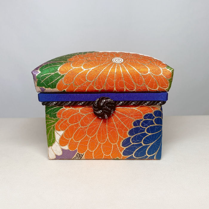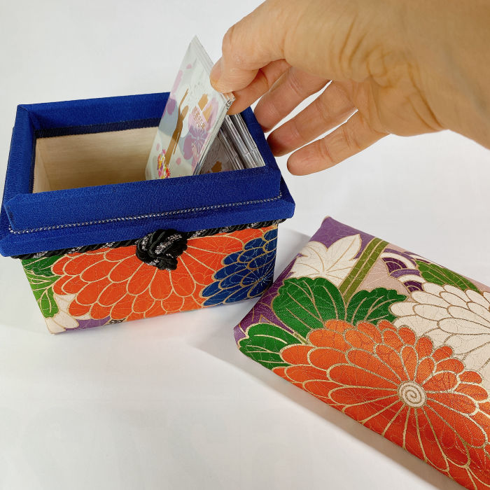 This handcrafted wooden box is covered in vivid silk from a vintage furisode kimono, creating a bold and elegant presence.