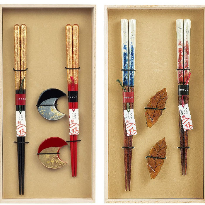 This set includes two types of lacquered chopsticks in paulownia wood boxes.